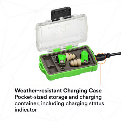 The 3M™ PELTOR™ Electronic Earplug helps protect your hearing, and can help improve situational awareness and communications in challenging environments. The earpieces are rechargeable via a micro-USB jack on the charging case. The case also provides easy and convenient storage of the earpieces when not being used. The small and lightweight design helps improve the overall comfort and user experience, and makes it compatible with most head borne Personal Protective Equipment (PPE), such as helmets and face shields. The earpieces and case are green colored.