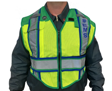 The UltraBright Green/Blue EMS Public Safety Vest from FIRENINJA is designed to clearly distinguish EMS responders on-scene while providing compliance-level traffic safety. It offers bold color identification, reflective striping, and breakaway features—ideal for high-risk, high-visibility environments.