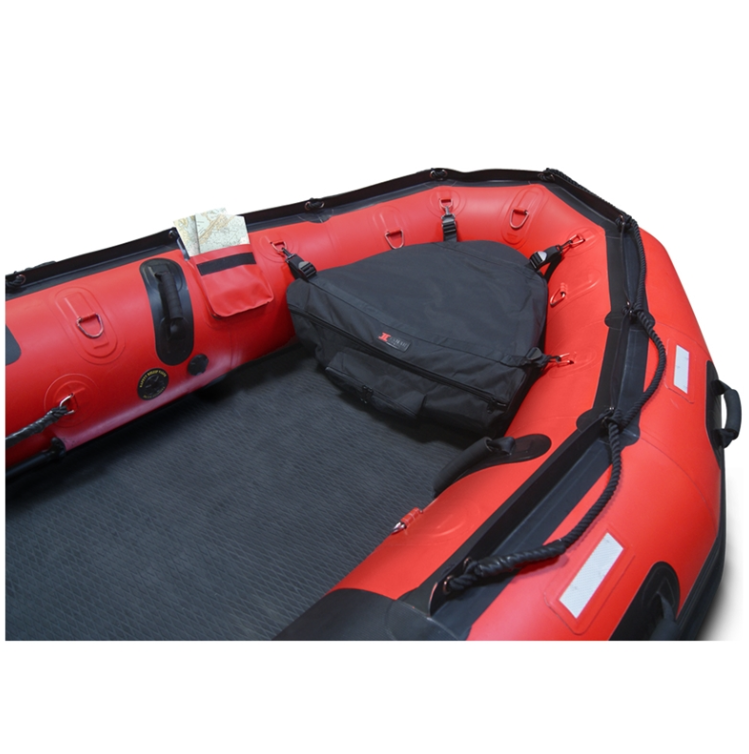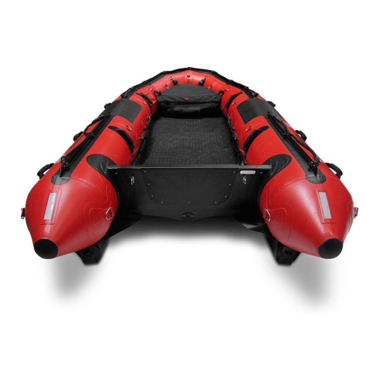 Spanning 14′ 0″ in length with a beam of 6′ 5″, the 430-SR balances stability and responsiveness in tight waterways or confined zones. At ~230 lb dry (with floor), it can carry up to 8 persons (2,395 lb load). Its tube system features a 15″ diameter, comprised of 5 + 1 separate inflation chambers for redundancy, built from Mehler technical fabric with RF-welded seams rated for –30 °C to +70 °C operation.