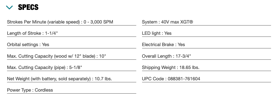 It features an orbital action setting for more aggressive cuts in wood, and a long 1-1/4” stroke length for greater cutting efficiency resulting in faster, deeper cuts. It also has a variable speed dial (0-3,000 strokes per minute) which enables the user to match the speed to the application.