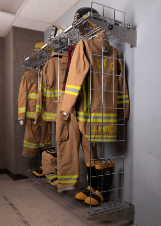 Additional features include adjustable apparel hooks, a label holder, and a hanging pole that runs the length of the unit, providing comprehensive storage solutions for firefighting gear.